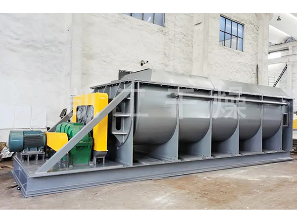 空心軸上密集排列著楔型中空漿葉,熱介質經空心軸流經漿葉。單位有效容積內傳熱面積很大,熱介質溫度從-40℃到320℃,可以是水蒸汽,也可以是液體型:如熱水、導熱油等。間接傳導加熱,沒有攜帶空氣帶走熱量,熱量均用來加熱物料。熱量損失僅為通過器體保溫層向環境的散熱。楔型漿葉傳熱面具有自清潔功能。物料顆粒與楔型面的相對運動產生洗刷作用,能夠洗刷掉楔型面上附著物料,使運轉中一直保持著清潔的傳熱面。漿葉干燥機的殼體為Ω型,殼體內一般安排二到四根空心攪拌軸。殼體有密封端蓋與上蓋,防止物料粉塵外泄而充分發揮作用。